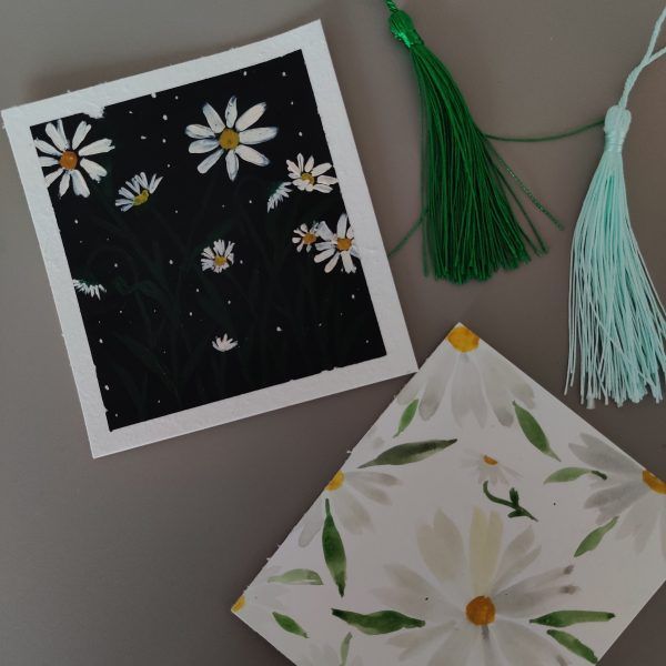 Amapolas, pintadas con acuarelas colores lila, morado, naranja, amarillo, rojo y verdes para las hojas y tallos